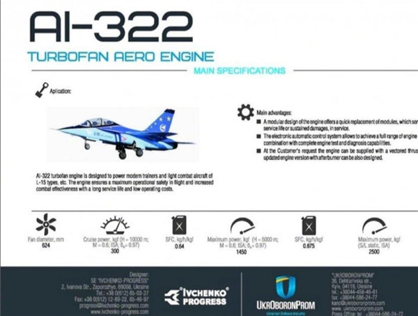 ?據(jù)烏克蘭媒體報道,烏克蘭馬達(dá)-西奇公司已經(jīng)簽署了一份合同,將向中方供應(yīng)400臺AI-322型渦輪風(fēng)扇發(fā)動機,合同的總價值約為8億美元,中航國際控股公司是簽約的進口商。AI-322發(fā)動機被選定為中國研制的L-15高級教練機的動力系統(tǒng)。毫無疑問,中國這8億美元“雪中送炭”的輸血訂單,又可以讓烏克蘭馬達(dá)西奇公司得以續(xù)命很久了。